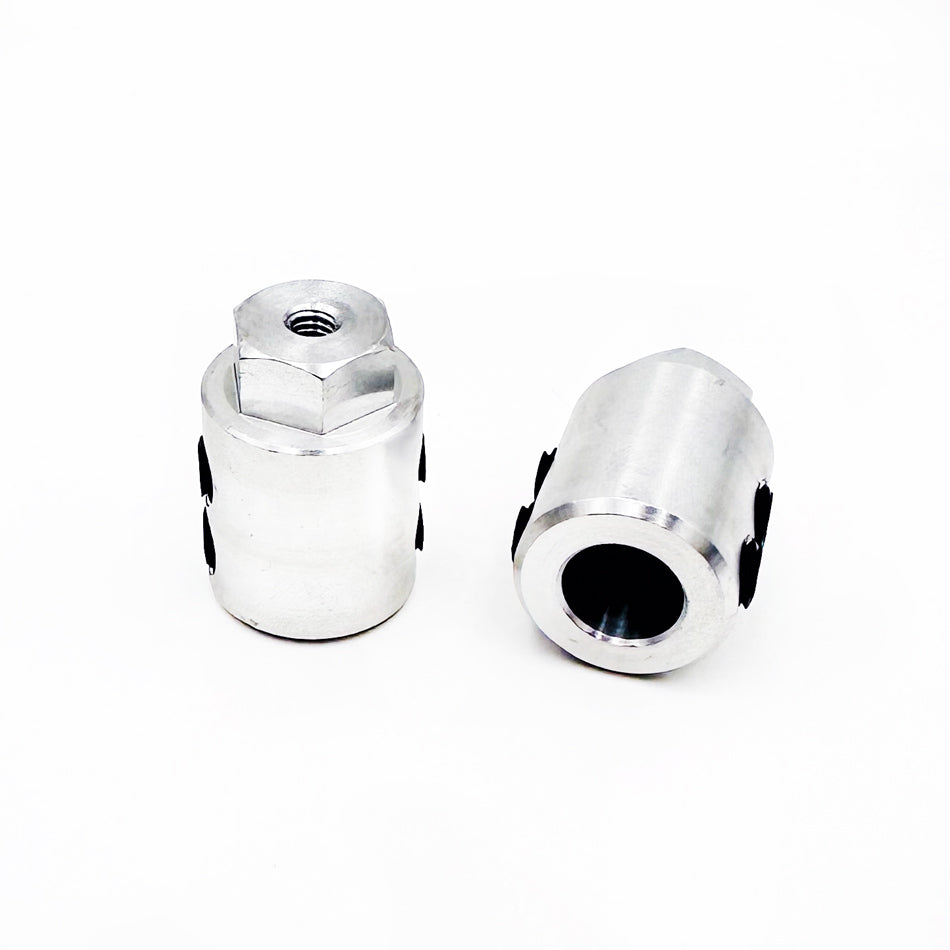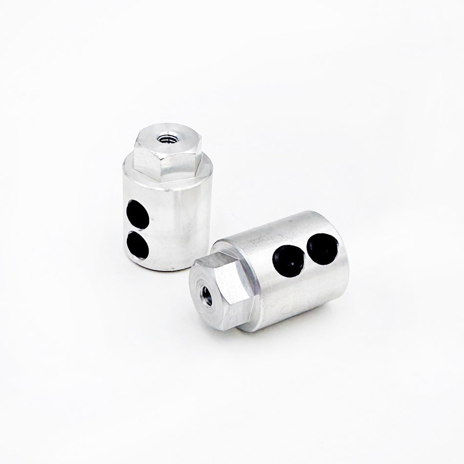 These 12mm Hex Adaptors allow you to attach 12mm hex drive wheels to 3/8" drive shafts. Simply insert a 3/8" shaft (D-shafting is recommended) into the adapter and tighten the set-screws. These 3/8" hubs are built more robust than our 1/4" hubs and feature 4 setscrews per hub.