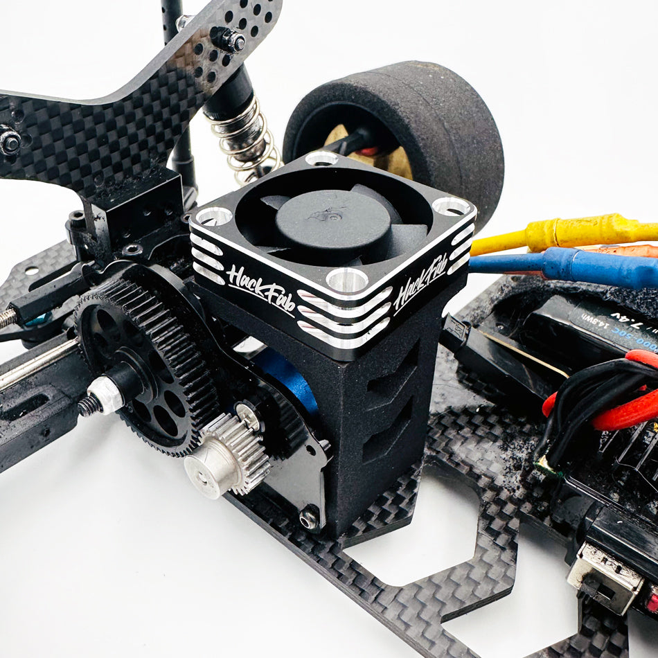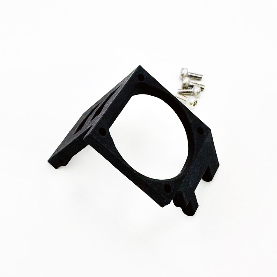 The mount includes 4 m2.5 screws to secure a 30x30 fan to the mount. A great fan option is our HackFab 30x30mm aluminum fan .