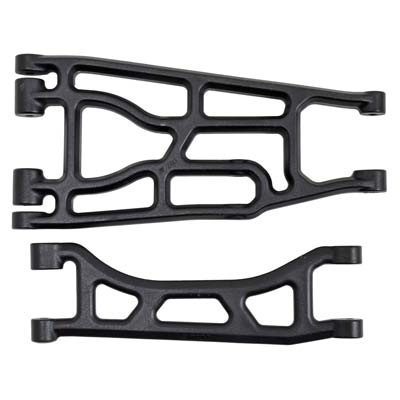 RPM's new X-Maxx A-arms are designed to be the strongest, lightest arms available. Starting with the upper A-arm, they used their proven A-arm designs from past successful builds to create an upper support structure sure to handle anything you can throw at it. Their lower A-arm has better ground clearance than stock A-arms and has a cross section based off of their proven 1:5 scale HPI Baja A-arms so you know they're tough. They've also created a double support beam on the lower arms to spread impact energy over a larger area, meaning hard hits won't force you into the "walk of shame". They're also universal fit, which means they'll fit on any corner of your truck. No more worrying which arm fits where.
