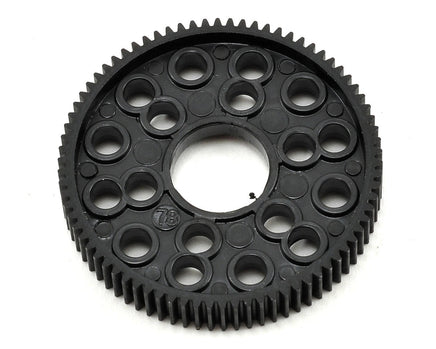 Kimbrough spur gears are full width, because a narrow or profiled plastic gear can deform under load, is weaker and less efficient. This can cause drag in the gear train and waste horsepower. The wider a gear is, the more load it can handle. The only time gear engineers narrow gears, is when there is a space limitation. Kimbrough Racing Products gears run quiet because they have the correct tooth shape and don't have to be narrowed. Choose from a variety of tooth count options to allow you to fine tune the torque and top speed of your model.