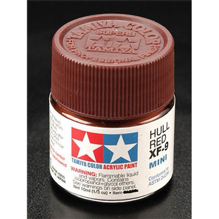 This Tamiya 10ml XF-9 Flat Hull Red Acrylic Paint is made from water-soluble acrylic resins and is excellent for either brush painting or air-brushing. These paints can be used on styrene resins, Styrofoam, wood, plus all of the common model plastics. The paint covers well, flows smoothly and can be blended easily. Prior to curing, paint can be washed away with plain water.