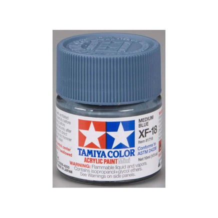 This Tamiya 10ml XF-18 Flat Medium Blue Acrylic Paint is made from water-soluble acrylic resins and is excellent for either brush painting or air-brushing. These paints can be used on styrene resins, Styrofoam, wood, plus all of the common model plastics. The paint covers well, flows smoothly and can be blended easily. Prior to curing, paint can be washed away with plain water.