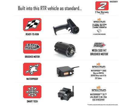 In addition to its remarkable durability and structural strength, the GORGON Monster Truck comes packed with high-quality, LiPo-compatible Spektrum electronics, ensuring precision control and optimal power management. It's equipped with a Spektrum S660 waterproof digital steering servo, guaranteeing precise and responsive handling even in challenging conditions. The inclusion of the Spektrum waterproof SLT 2-in-1 ESC/receiver unit enhances the truck's resilience, making it a formidable performer in wet and muddy environments. With the Spektrum SLT2 2-channel 2.4GHz transmitter in hand, you'll experience a secure and uninterrupted connection, allowing you to push the GORGON's capabilities to the max while maintaining complete control.