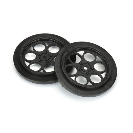 This is a pair of Showtime Front Runner 2.2"/2.7" Black Drag Racing Front Wheels. It's Showtime! Pro-Line has an all-new 2.2"/2.7" Black Drag Front Wheel featuring a scale spoke pattern that mimics full-size drag wheels. The Showtime Front Runner 2.2"/2.7" wheel is a perfect fit for Pro-Line's new Front Runner 2.2"/2.7" Tires (PRO10197203) and is designed to be super lightweight and narrow for maximum performance. The Showtime Front Runner Wheels are a strong and lightweight 12mm hex wheel making them the ideal choice for performance drag racing. The wheel offset is ideal for Losi® 22S™ No Prep Drag Car, 2wd Slash® trucks converted to no-prep Drag Racing cars, and AE DR10. This wheel is designed to eliminate the need for foam insert completely for the ultimate in lightweight performance. The Showtime Front Runner Wheel is proudly made by Pro-Line and Made in the USA. Launch your no-prep Dragster to the next level with the Pro-Line Showtime Front Runner Drag Wheels today!