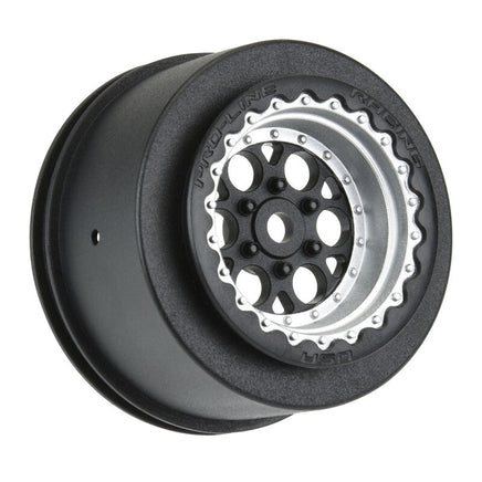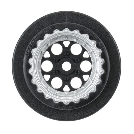 This is a pair of Showtime+ Mini Drag Racing Rear Wheels. The Showtime+ wheel is 15% wider than the stock wheel for extra stability on your Losi® Mini No-Prep drag car. These 8mm hex wheels feature a modern two-toned Silver & Black, creating a unique, super-scale look on your mini no-prep ride. Pair these with the Reaction HP Belted Mini Drag Tires (PRO1023600, sold separately) for the ultimate upgrade combination!