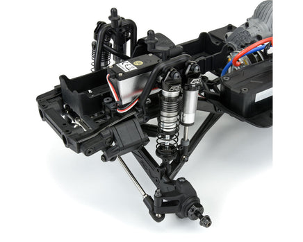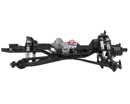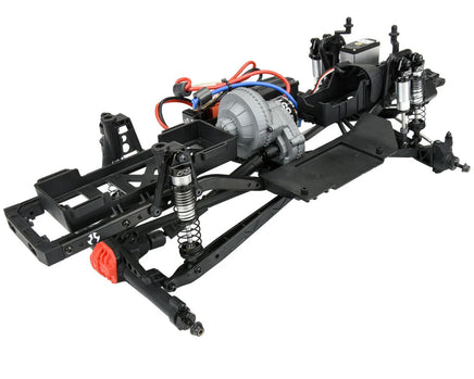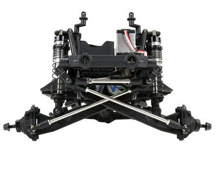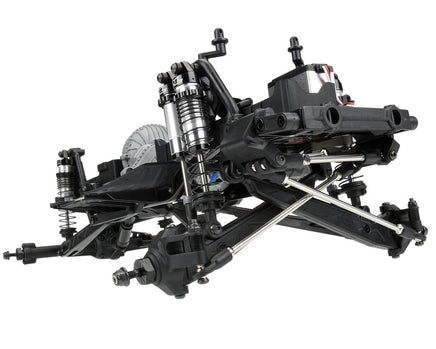 The Twin I-Beam front suspension features a pair of long "I-beam" arms that intersect in an X-pattern, effectively managing lateral forces on the wheels. Complementing this, radius arms extend backward toward the central skid plate, providing stability in the fore-aft direction for each wheel. Designed to mirror the geometry of full-sized trucks, this super-scale conversion kit incorporates true swing set steering and center-mount radius arms to enhance handling across the entire range of suspension travel.