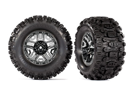 Ultra-rugged Sledgehammer® tires provides extreme traction and control for a variety of off-road terrain. The Sledgehammer's increased overall diameter provides additional ground clearance, while the open block tread design clears mud and debris for unmatched traction in loose surfaces. The tires are TSM®-rated for high-speed and come pre-mounted with foam inserts and glued to 2.8” black chrome wheels with a black beadlock-style ring. Fits 12 mm hex, front or rear.