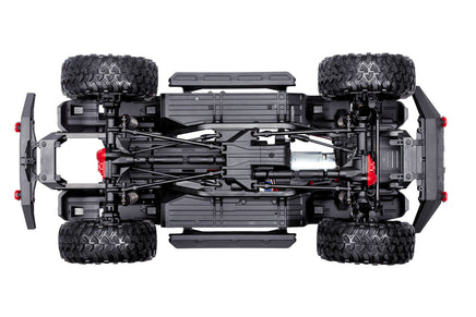 Underneath the stylish body lies a robust drivetrain and suspension system engineered for unparalleled durability and performance. The full-time shaft-driven 4-wheel drive system, complemented by heavy-duty steel frame rails and hardened steel U-joints, ensures that the TRX-4 Sport can handle the most demanding terrains with ease. The portal axles significantly increase ground clearance and eliminate torque twist, improving axle geometry and reducing strain on the driveshafts. The vehicle's suspension system features front 3-link with panhard and rear triangulated 4-link setups, combined with heavy-duty steel link rods and aluminum GTS shocks. These oil-filled coil-over shocks, exclusive to the TRX-4 chassis, provide silky smooth damping and are easily adjustable for optimal ride height, ensuring the truck remains stable and responsive on any trail.