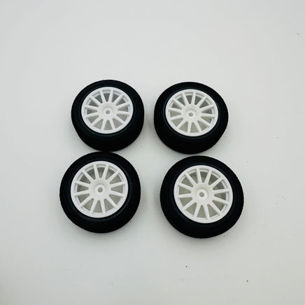A set of four foam tires mounted to white factory Latrax rally wheels. Approx 50mm outer diameter