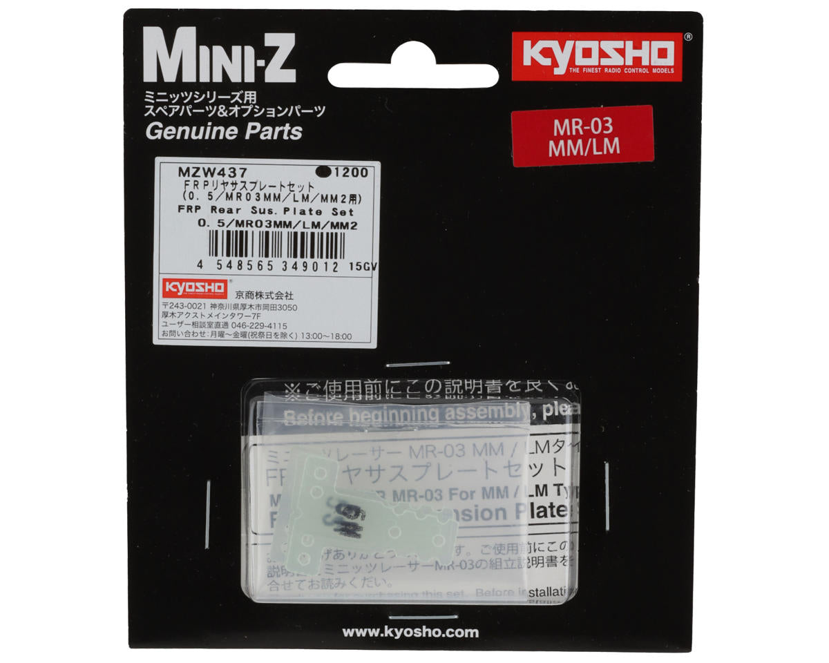 Kyosho FRP Rear Suspension Plate Set. This optional suspension plate set is intended to fit the Mini-Z MR-03MM, LM, and MM2 vehicles. Included are soft, medium and hard plates giving you the ability to tune the suspension to your preference. Package includes one soft rear suspension plate, one medium rear suspension plate and one hard rear suspension plate.