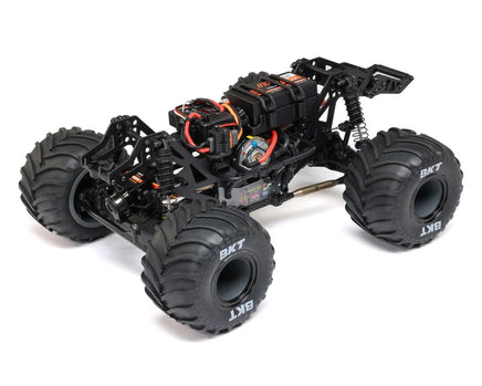 The Losi Mini LMT Megalodon is designed for superior performance on a variety of surfaces, thanks to its high-quality components. Officially licensed BKT tires, commonly used by professional drivers in Monster Jam, feature a chevron tread design that provides excellent traction while reducing the risk of rollovers with a smooth sidewall transition. Beneath the body, the 1.5mm powder-coated 6061-T6 aluminum chassis plates enhance durability and add to the truck's scale realism. The 4x4 drivetrain with a center spool ensures ultimate traction, allowing the front and rear tires to rotate at the same rate for impressive freestyle action. Handling is exceptional, with threaded oil-filled shocks that allow easy adjustments to the ride height and provide superior control during jumps and harsh landings. The full ball bearings throughout the drivetrain ensure smooth, efficient movement, while the suspension system with sway bars keeps the truck stable and responsive during high-speed turns.