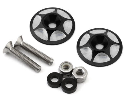 The McAllister Large Sprint Wing Buttons are high-quality aluminum wing buttons designed for use with RC sprint cars. These buttons are essential for securing the top wing slider on your sprint car. The kit includes two 18mm wing buttons, two spacers for the slider, and two M3 stainless screws and lock nuts for complete mounting. Available in multiple colors, these wing buttons provide both functionality and a sleek look for your RC vehicle.