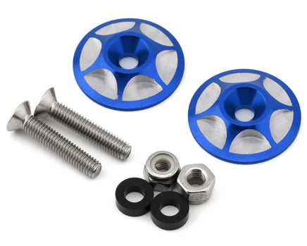 The McAllister Large Sprint Wing Buttons are high-quality aluminum wing buttons designed for use with RC sprint cars. These buttons are essential for securing the top wing slider on your sprint car. The kit includes two 18mm wing buttons, two spacers for the slider, and two M3 stainless screws and lock nuts for complete mounting. Available in multiple colors, these wing buttons provide both functionality and a sleek look for your RC vehicle.