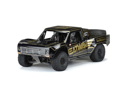 The Pro-Line 1967 Black Ford F-100 "Heatwave Edition" Pre-Painted and Pre-Cut Body is a rough and ready way to beef up the appearance of your Unlimited Desert Racer 4WD Race Truck. Now you can build a fully licensed replica of the popular full-size" Heatwave Trophy Truck" driven by Chris Isenhouer. Chris races his iconic Black and Gold Heatwave Ford F-100 converted to Trophy Truck specs in the unrelenting desert along with his brother Nick. Pro-Line is proud to bring Chris’ truck to life for your Traxxas UDR, made from Pre-Painted and Pre-Cut Black Polycarbonate. The massive Black and Gold Heatwave decal wrap is also included and pre-cut for easy installation.
