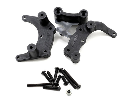 The RPM rear bumper/wheelie bar mount has two mounting holes on the gear cover side and three on the motor side – that’s two additional mounting points to eliminate that annoying hinge effect mentioned above. The additional mounting screws help disperse impact energy into the transmission case over more surface area, reducing the possibility of damaging the case significantly! The new RPM mount design means no more slotted parts hanging below the rear skid plate – ever! The RPM mount tucks up quite nicely behind the skid plate for better rear end ground clearance.